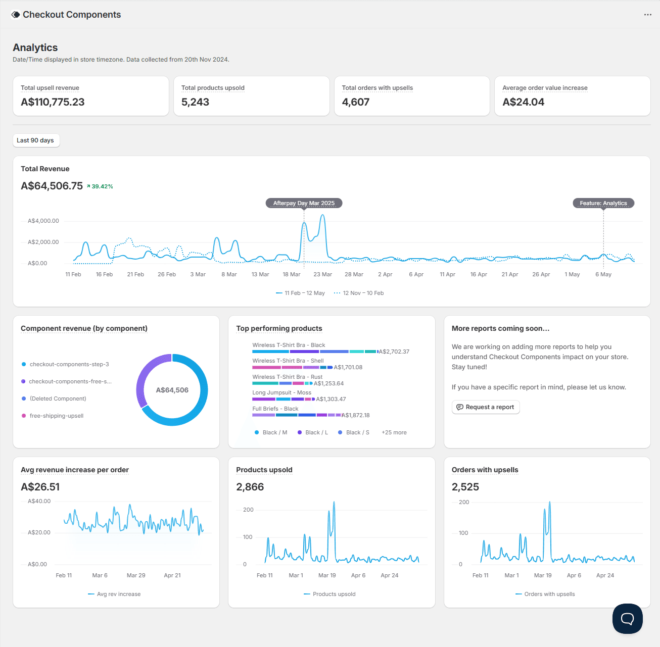 All plans on Checkout Components get access to insights on how their upsell components and products are performing.
