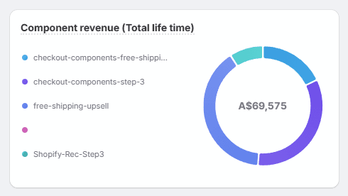 This chart provides an at-a-glance overview of the revenue generated by the app and breaks it down by each upsell component. It is interactive, allowing merchants to see exactly how much each part (e.g., checkout steps, free shipping offers, recommendations) contributes to the overall upsell revenue. This helps store owners quickly identify the most effective components, optimize their setup, and track how the app is boosting sales over time.