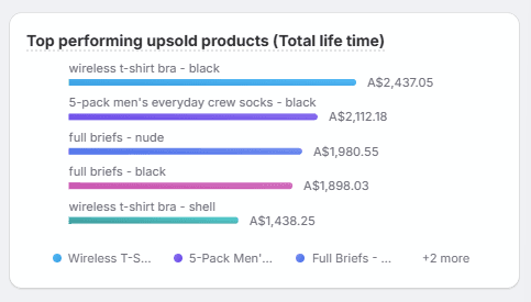 This chart highlights the top-performing products being upsold through the app, sorted by total lifetime revenue. It gives merchants a quick overview of which items customers are most likely to add on at checkout and how much each item contributes to their overall upsell performance. This insight helps in pinpointing winning products and adjusting upsell strategies accordingly.