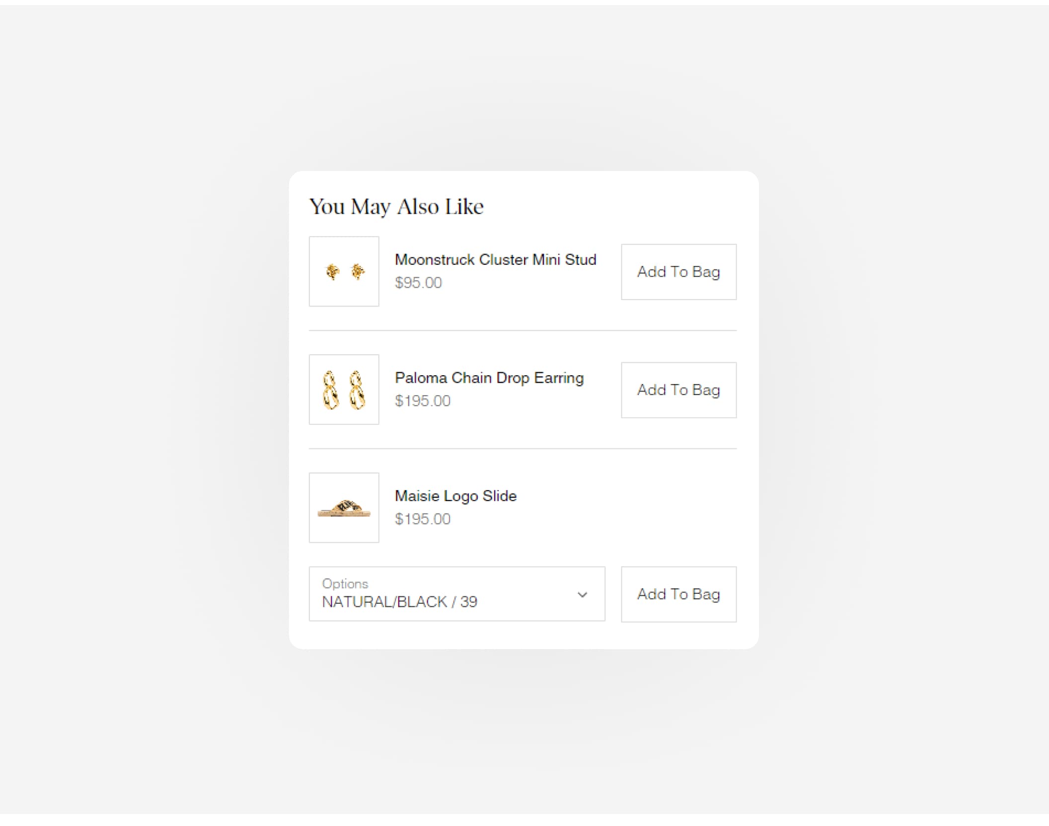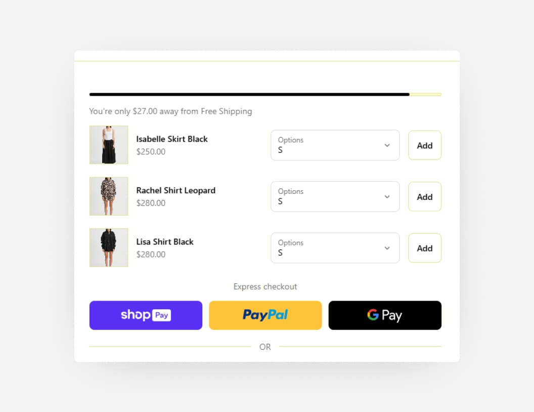 The most versatile upsell component is the upsell list. This component allows you to display a list of products to your customers, and they can add these products to their cart with a single click. You can configure the upsell list to display products from a specific collection, manually select products or let Shopify AI decide which products to display by analysing the customers cart.
