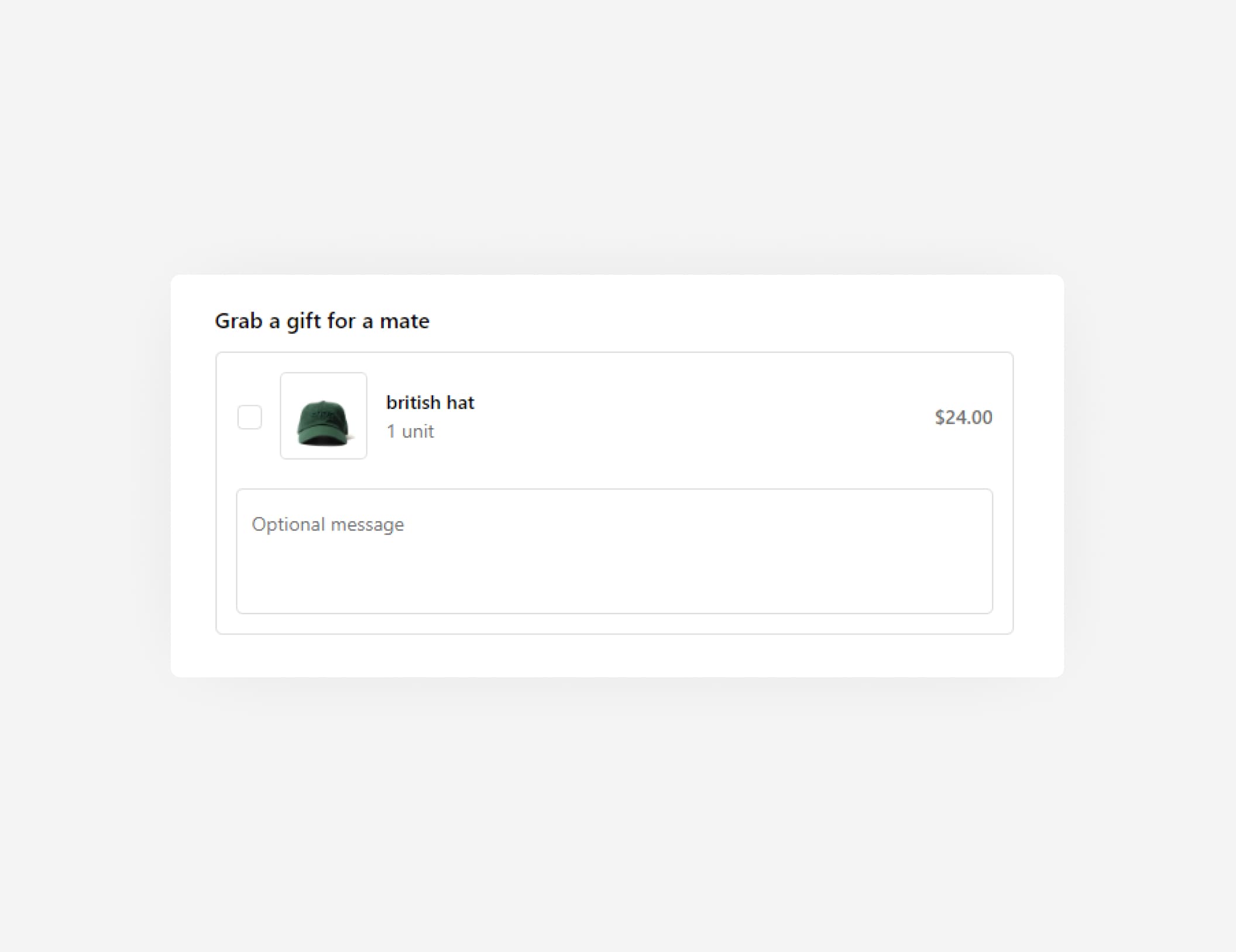 - Default renders a "1 unit" message next to the checkbox. This setting allows your to set your own value, such as "Add a gift message".
